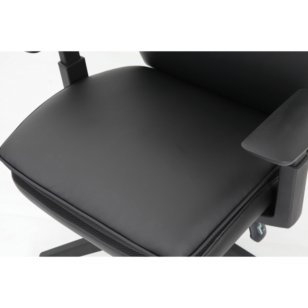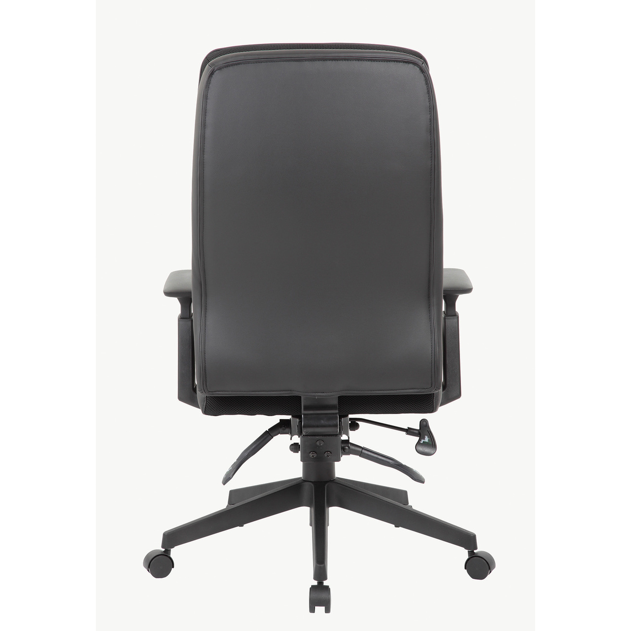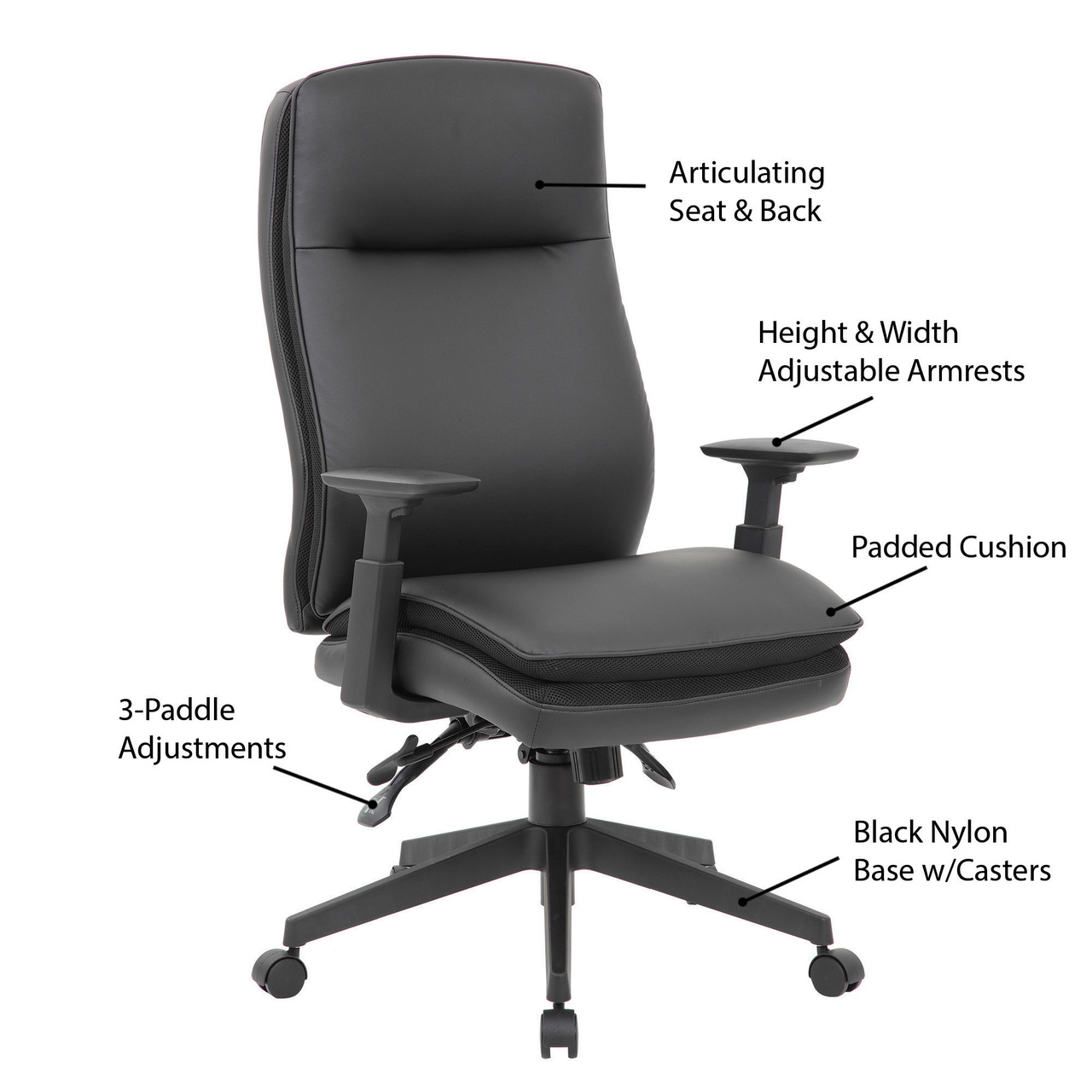 Beautifully upholstered with ultra soft and durable Leather-Soft upholstery. Executive High Back styling with extra lumbar support. Adjustable height arm rests. 3 paddle multi-function mechanism. Solid 27" high crown nylon base with casters. Adjustable tilt tension control.