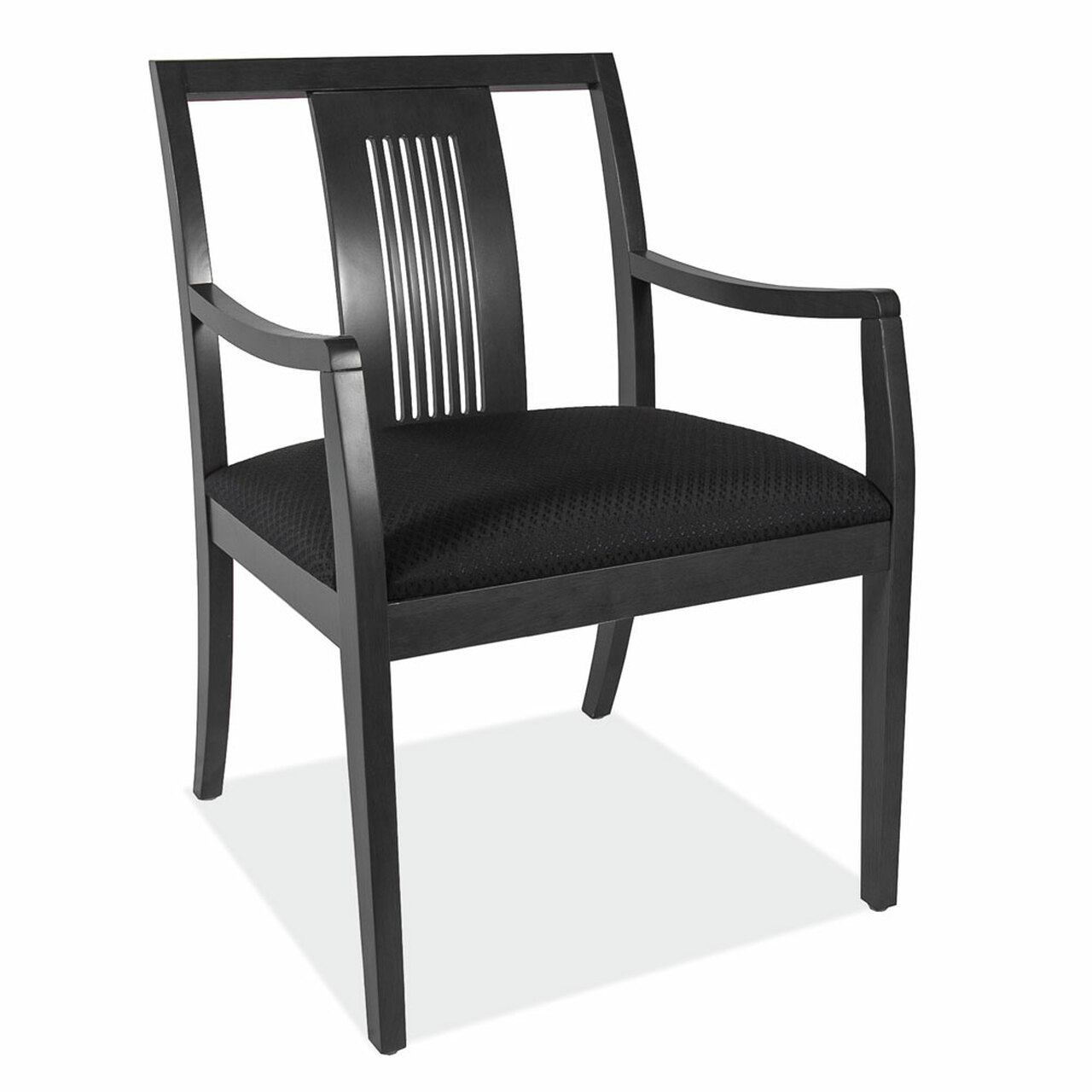 This slat back, guest chair with an espresso frame is ideal for reception areas or executive offices. The cushioned seat provide ample comfort for yourself or guests, while the design of the chair is also durable and sophisticated. Give your space a presidential feel with this guest chair from our Rex Collection.